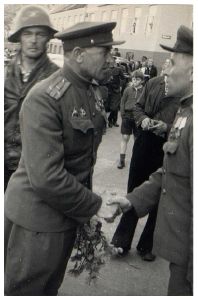 Enkeltfoto fra album med fotos af Bornholm og bombeskaderne fra russernes bombardementer. Indlagte kort over Rønne og Nexø med markeringer af bombenedslag. Fremstillet af Bornholms Amt og givet til socialminister S.P. Larsen den 24.11.1945.