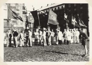 Enkeltfoto fra fotalbum indeholdende 2 sider med fotos af tyske troppers afmarch fra København samt Den Danske Brigade. Ellers mest fotos fra København i 1956, dels hverdagsbilleder og dels fotos af sporvogne. Også ældre sporvejshistoriske postkort.
