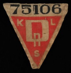 "betegnelse": "Trekantet fangenummer ned sort/rødt tryk på hvidt stof",