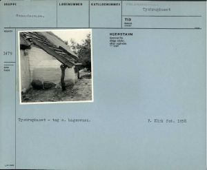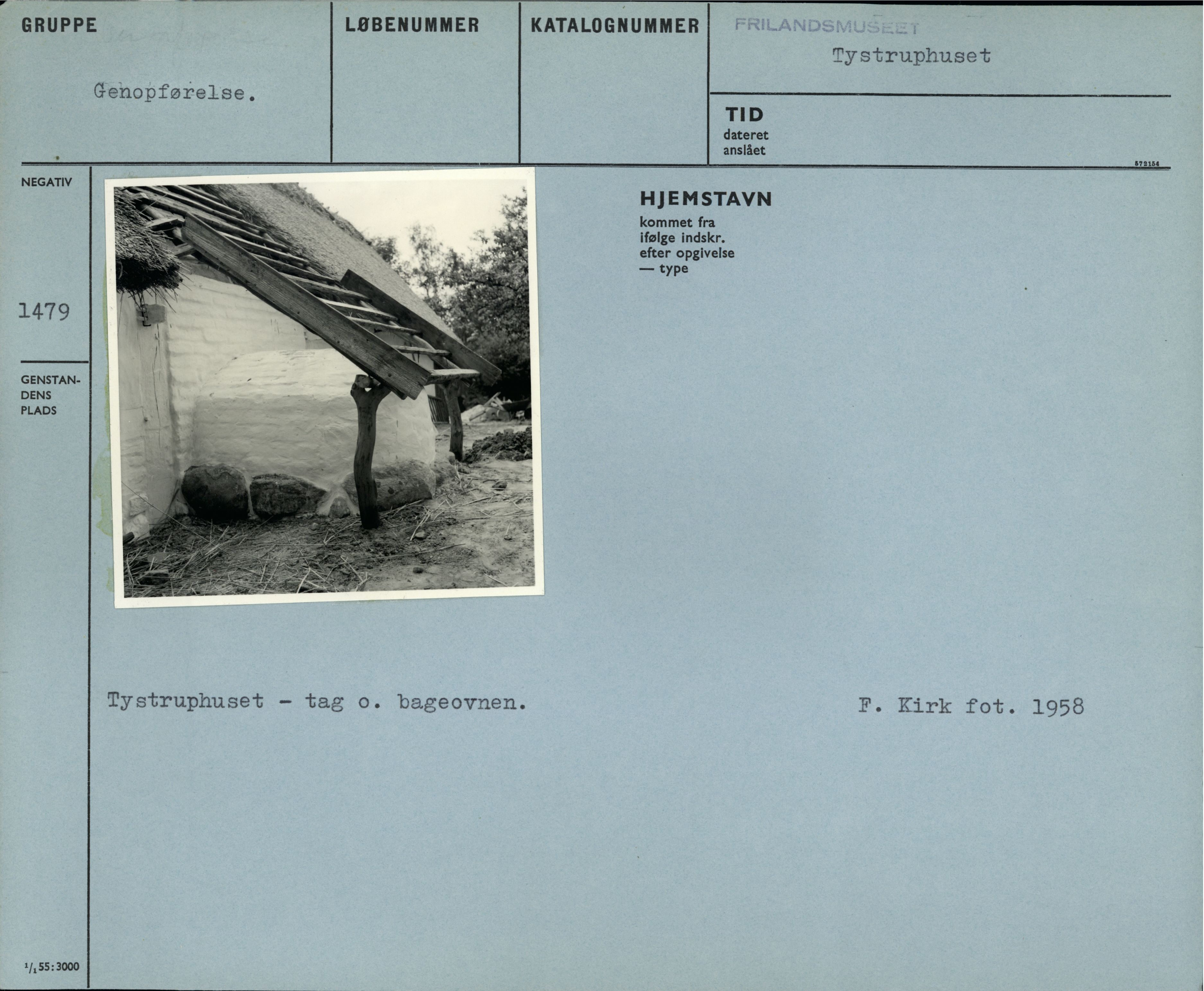 Genopførelse. Tystruphuset - tag o. bageovnen. F. Kirk fot. 1958
