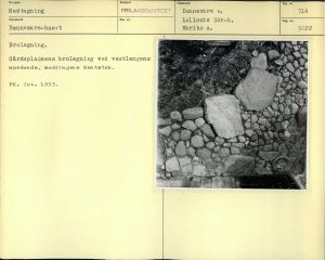 Nedtagning. Gårdspladsens brolægning ved vestlængens nordende, møddingens kantsten. FK. fot. 1953.