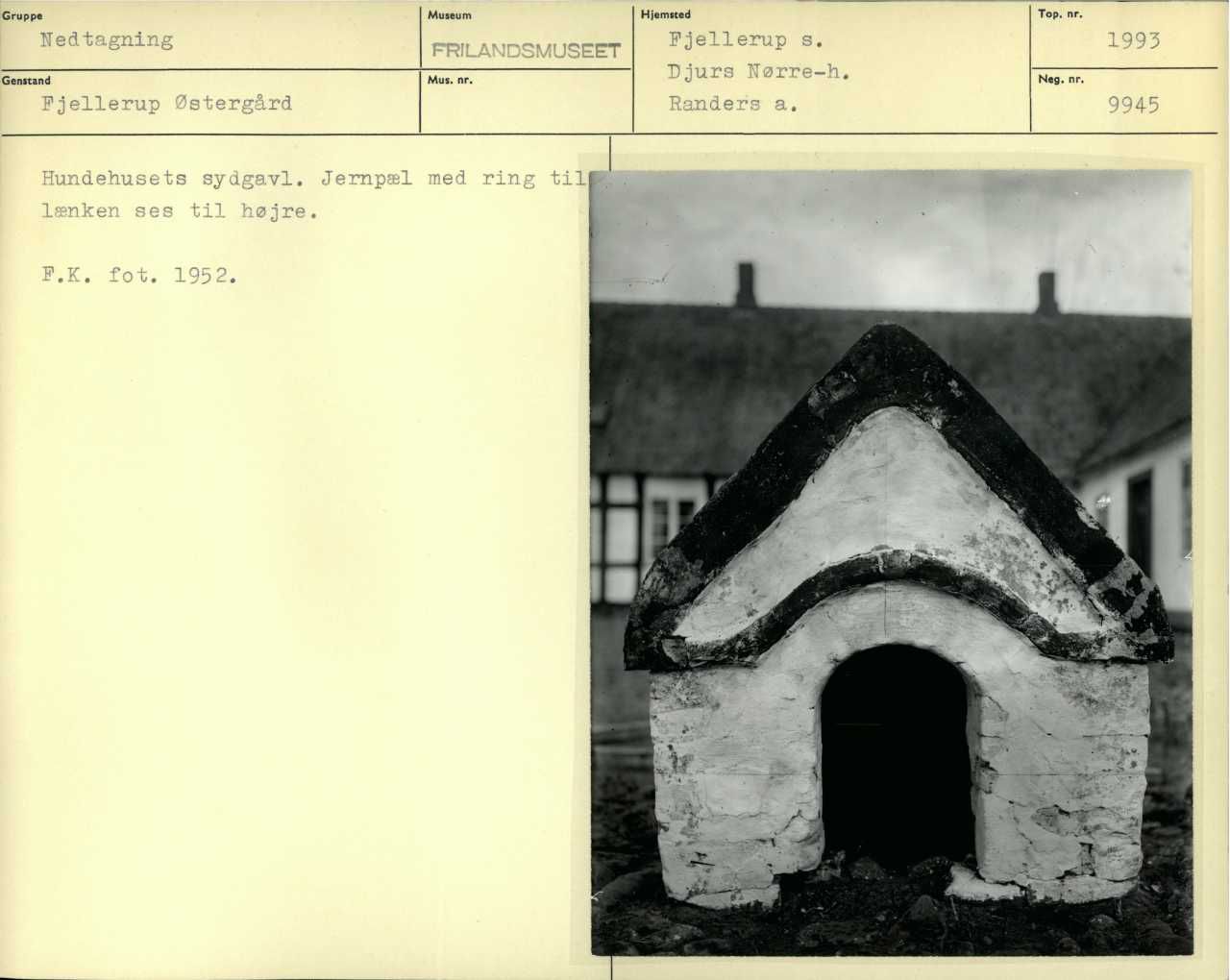 Nedtagning. Hundehusets sydgavl. Jernpæl med ring til lænken ses til højre. F. K. fot. 1952.