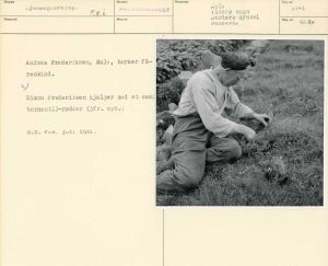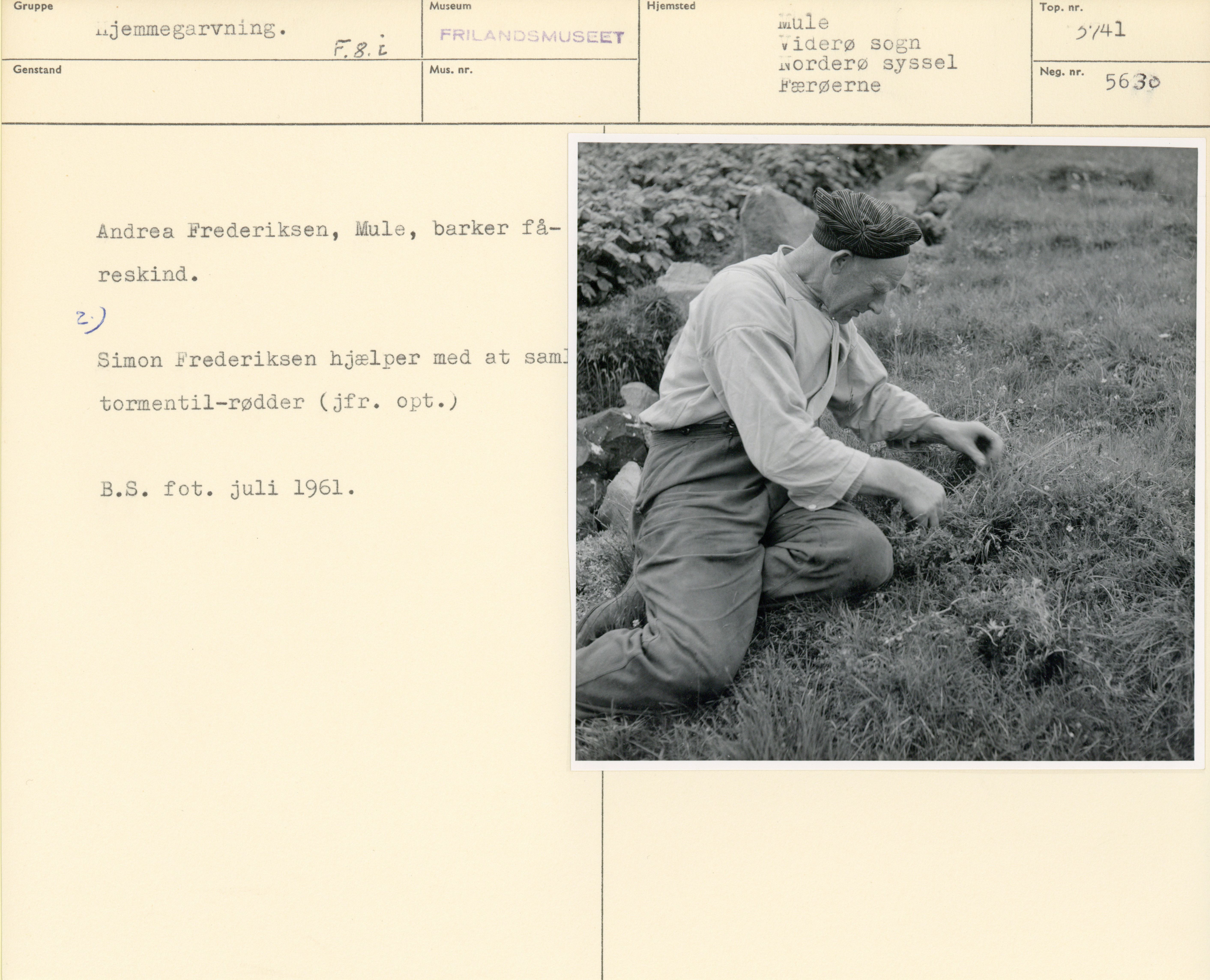 Andrea Frederiksen, Mule, barker fåreskind. 2) Simon Frederiksen hjælper med at samle tormentil-rødder (jfr. opt.) B.S. fot. juli 1961.