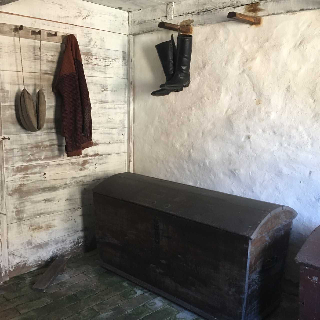 Sydøstlige hjørne af karlekammeret med knager til tøj. De kraftige knager er beregnet til seletøj.
