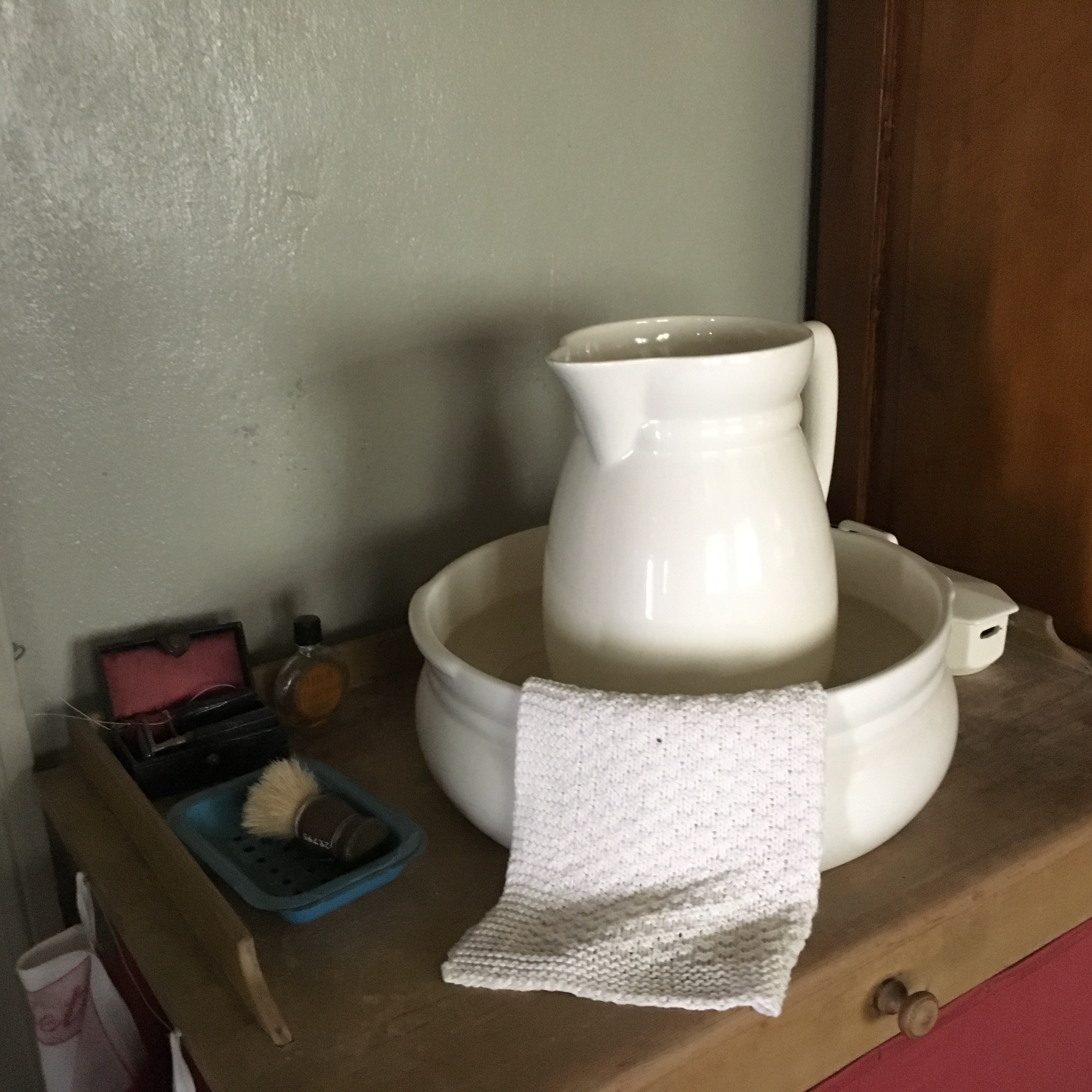 Interiør fra soveværelset. Detalje af ting ved vaskepladsen: Servantestel, håndklæde, sæbeskål og diverse barbergrej.