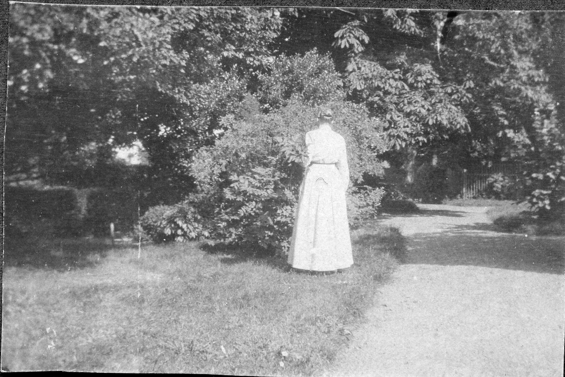 Kvinde i lang kjole med ryggen til. Adzer Justesen med familie forpagtede gården 1905-1920