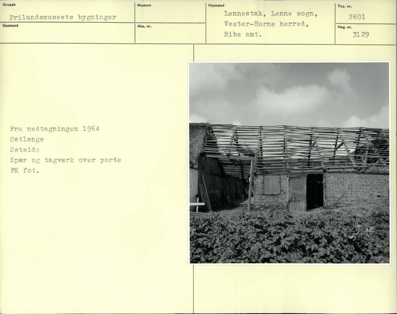 Gården fra Lønnestak under nedtagningen 1964. Østlænge. Østside. Spær og tagværk over port. FK fot.