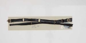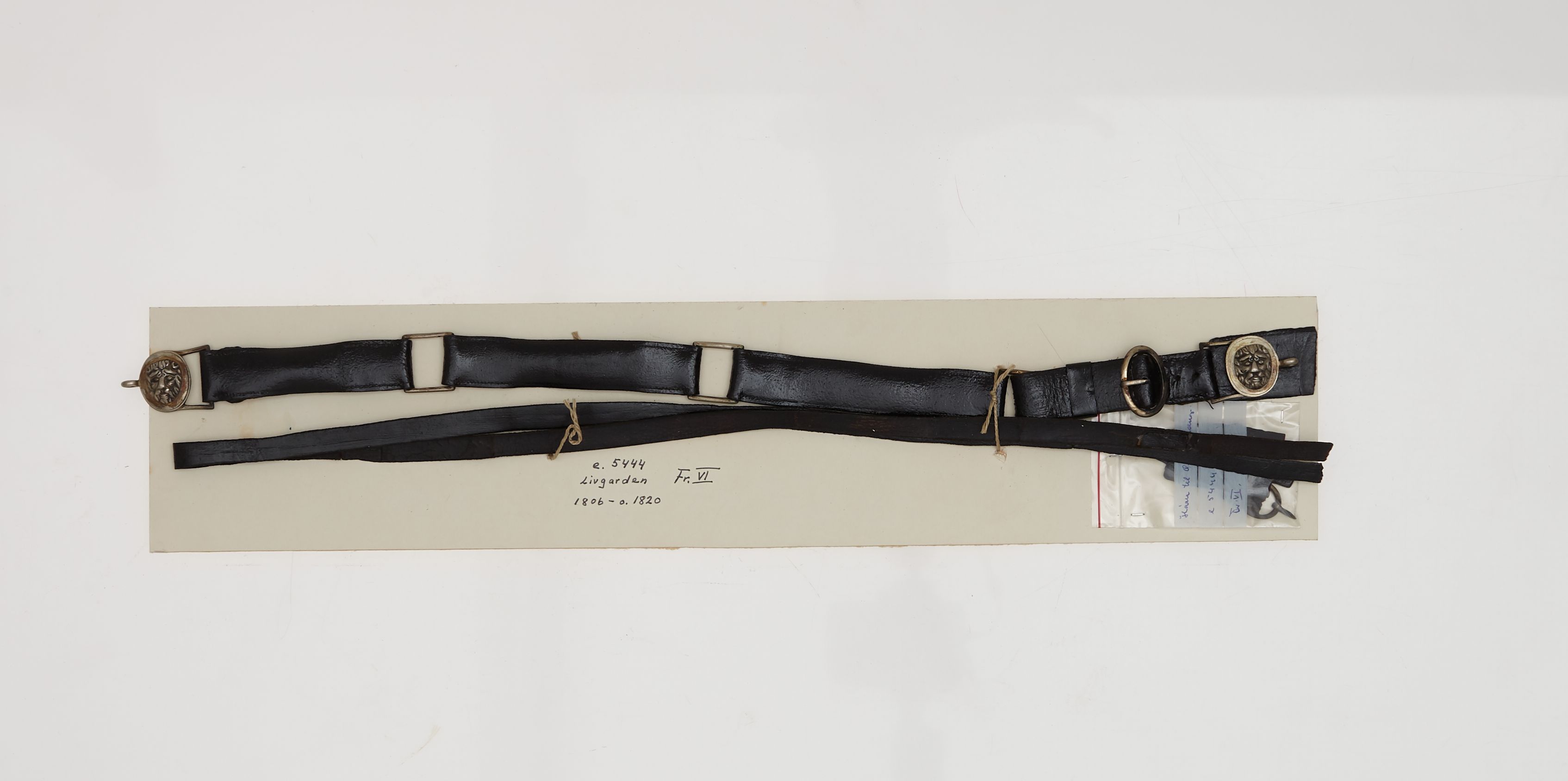 "Livgehæng for officerer af Livgarden til Fods og Hest, efter 1806 ifølge håndkortet. Men dette er spekulation da der ikke er nogen proveniens. Et sådant gehæng mangler ikke i Den Historiske Prøvesamling!\n\nSort lakeret læder. 3 cm. bredt. \nBæltet er inddelt i 4 stykker ved hjælp af 3 firkantede led af sølv. \nDet ene yderste led er dobbelt læder med et ovalt spænde til justering af længden. \nSpændet består af to sølvplader med et ophøjet løvehoved. S-krogen mangler. Pladerne er let ovale, 3,5 cm. høje. Det venstre er mærket bagpå med \"No2\". Til gehænget hører en lang smal 1,5 cm. bred sabelbærerem, længde 1,35 m. Forneden af denne rem er et spænde, der nu er brækket af og ligger i en pose ved livremmen. Den anden sabelbærerem mangler.\nGehænget må være et af de tidligere gehæng for Livgarden til Fods, da alle officerer fra 6/3 1806 skulle bære et sortlakeret smallere gehæng med to løvehoveder og en hage til at hægte foran. \nBegge Livgarder skulle bære sølvløvehoveder, andre officerer af guld. Hvor står det? Normalen var bare at metalbeslagene på gehænget skulle følge uniformens knapfarve.\nLøvehovederne er af sølv, men uden stempler, og det må have været brugt fra omkring 1806, indtil der blev reglementeret kort sabelbærerem og krog til ophængning."
