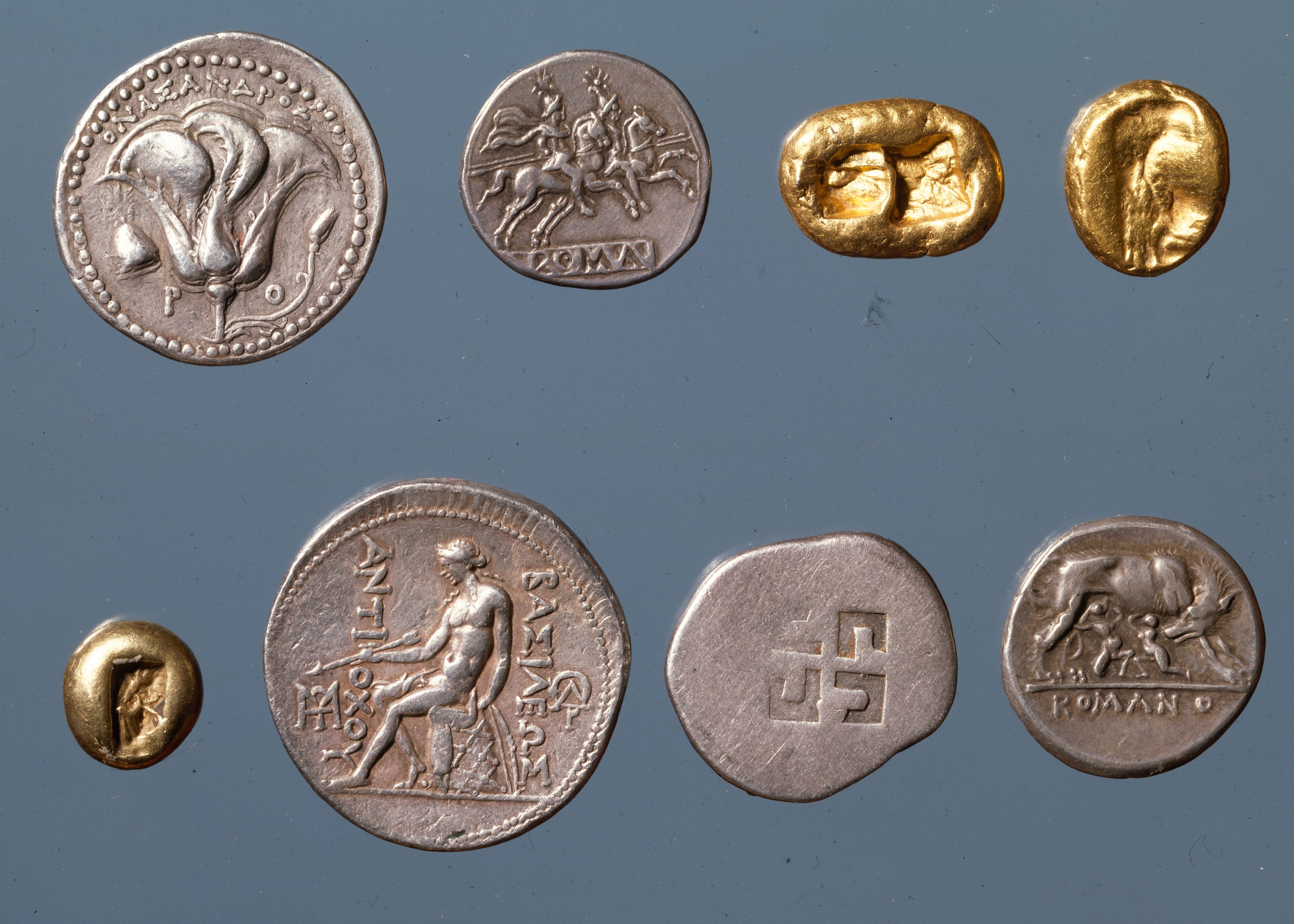 Antik, bs til FF404: 1: Rhodos, tetradrk, 304-189 f.Kr.SNG 26.757. 2:Rom denar 2. Årh. f.Kr. 3: Lydisk guld-stater Sardis SNG 28.454. 4: Perisen SNG 38.275. 5: Lydia SNG 28.449. 6: Anthiochos SNG 35.80. 7: Korint SNG 15.3. 8: Rom