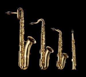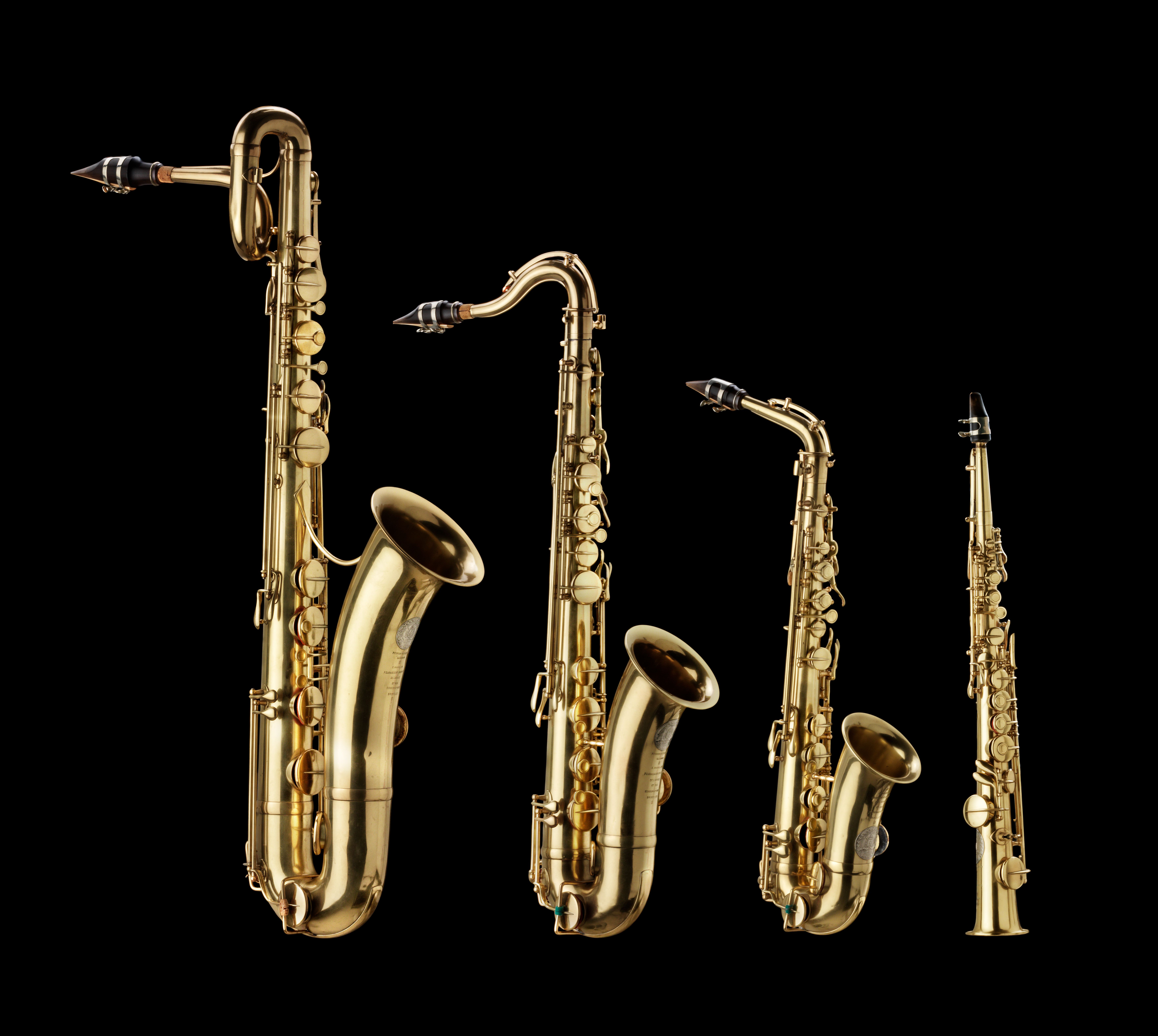 Saxofoner (baryton i Es; tenor i B; alt i Es; sopran i B) bygget af C. Mahillon (1836-1935), Bruxelles ca. 1900. Signeret: C. MAHILLON FOURNISSEUR BREVETÉ DE L'ARMEE ET DES CONSERVATOIRES BRUXELLES