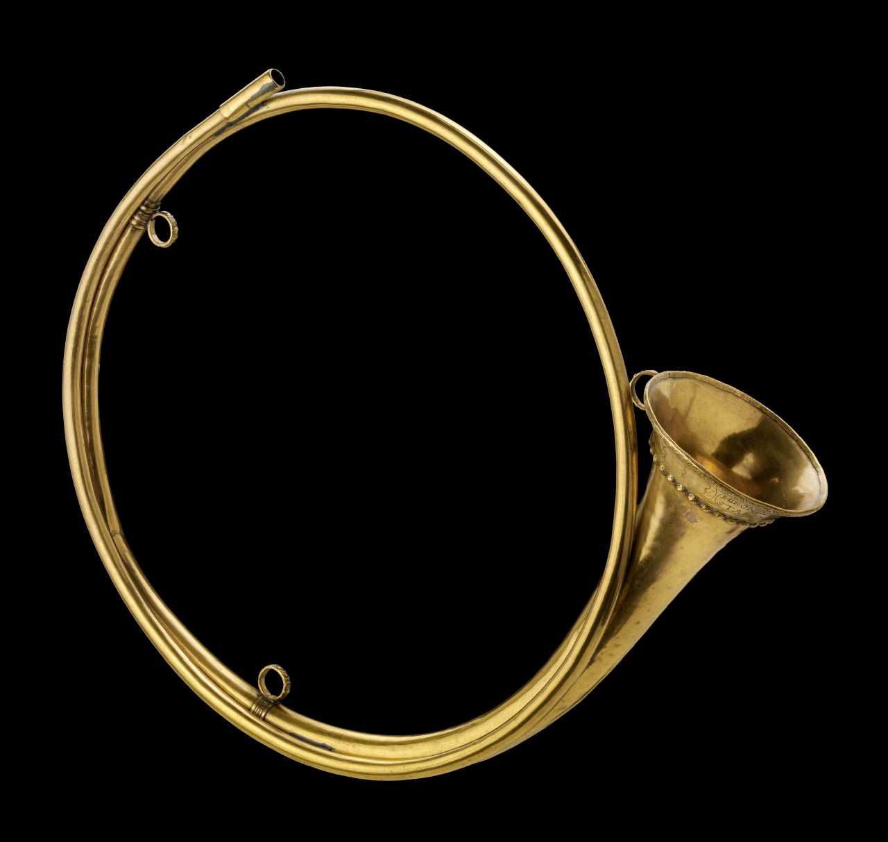 Valdhorn bygget af Hieronimus Starck (1640-1693), Nürnberg 1667. Signatur: Hironimus Starck Nvrnberg 1667 (samt våbenskjold og initialer)