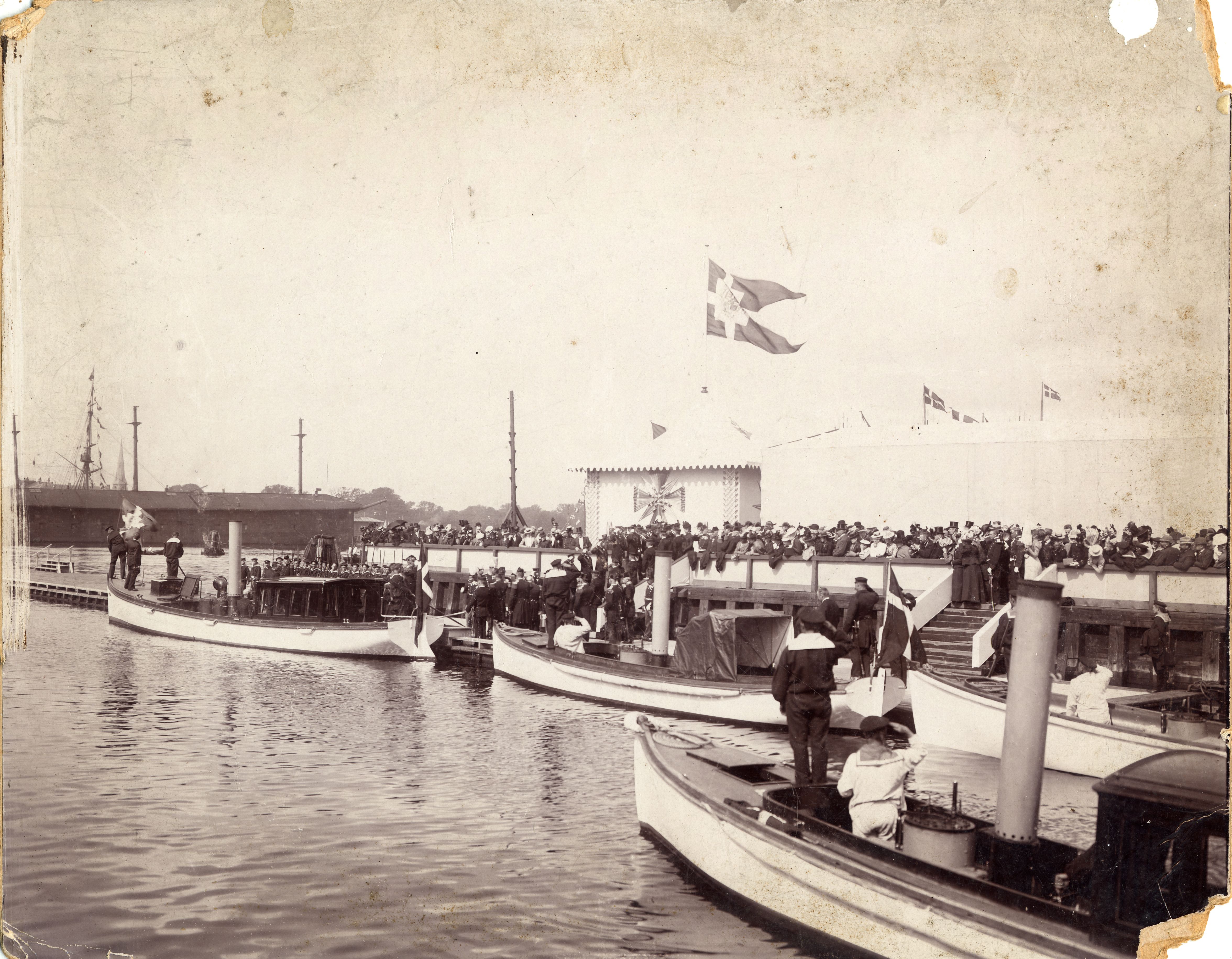 Foto, s/h: Fire chalupper, deriblandt Kongechalup længst til venstre foran træbro. På broen en mængde uniformerede og civilklædte mænd samt kvinder. Bag broen er opstillet store telte. Over teltet længst til venstre vejer kongeflaget. Teltvæggen er prydet med stort malteserkors. De tre chalupper har lagt til broen, mens den fjerde - forrest i billedet- ikke er landfast. Alle chalupper er udstyret med dampmaskiner. Kongechaluppen fører kongeflaget i stævnen og - som de andre - Dannebrog i splitflag i agterstavnen. På træbroen ud for kongechaluppen står marinesoldater i retstilling med gevær og bajonet. I baggrunden til venstre ses oplagt orlogsskib med undermaster og tag over dæk. Bag ved dette skimtes fregatten "Jylland".