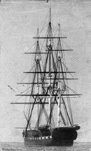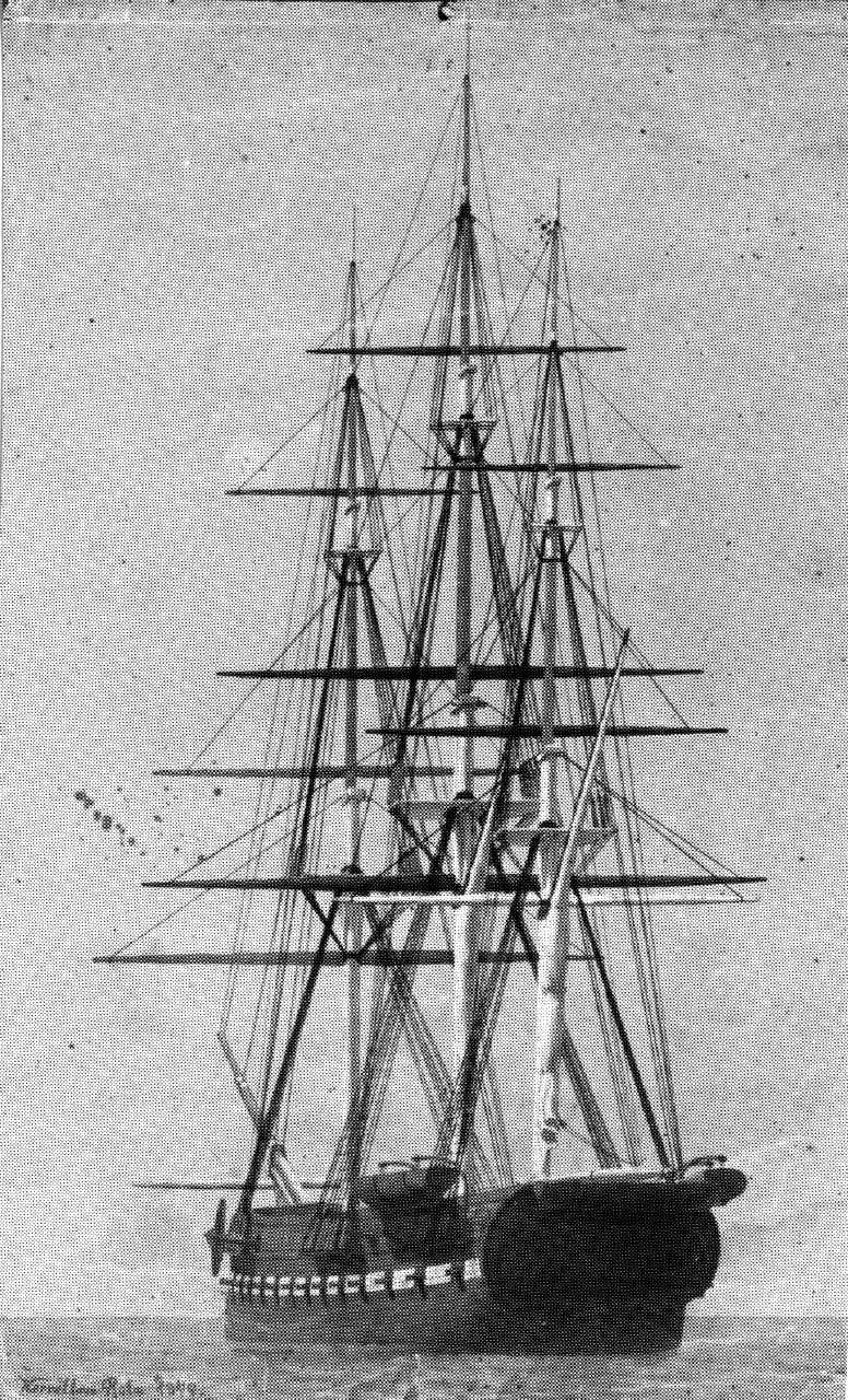 Tuschlavering med kridt: Fregatten Rota, Bygget 1822, set agten for tværs mod bagbord. Nederst i venstre hjørne anført: Korvetten Rota 1849. Profileret ramme guld/sølv (5 cm). Usigneret.