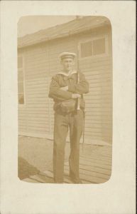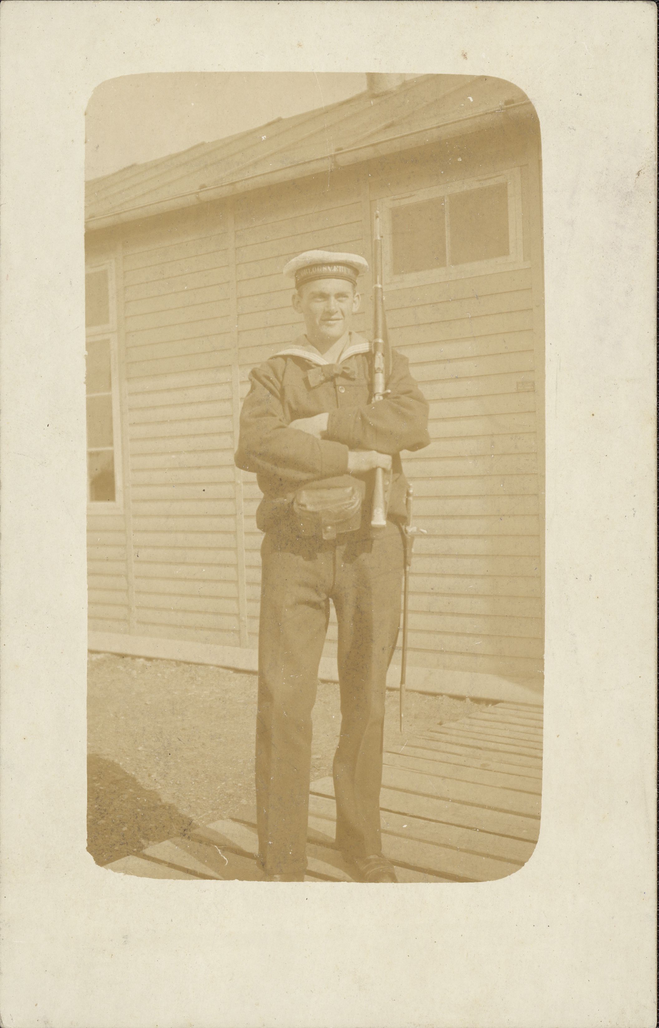 Postkort af marinesoldat som står vagt med gevær ved skulder. Ca. 1915