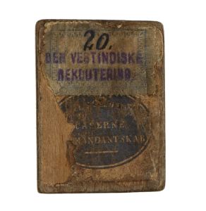 Med papirmærkat. Ca. 5x4cm. Med påtrykt tekst: "20 Den Vestindiske Recrutering. Casernee Kommandantskab".