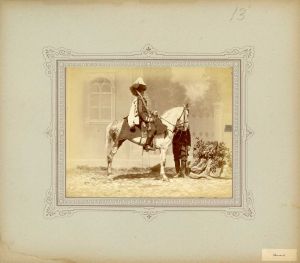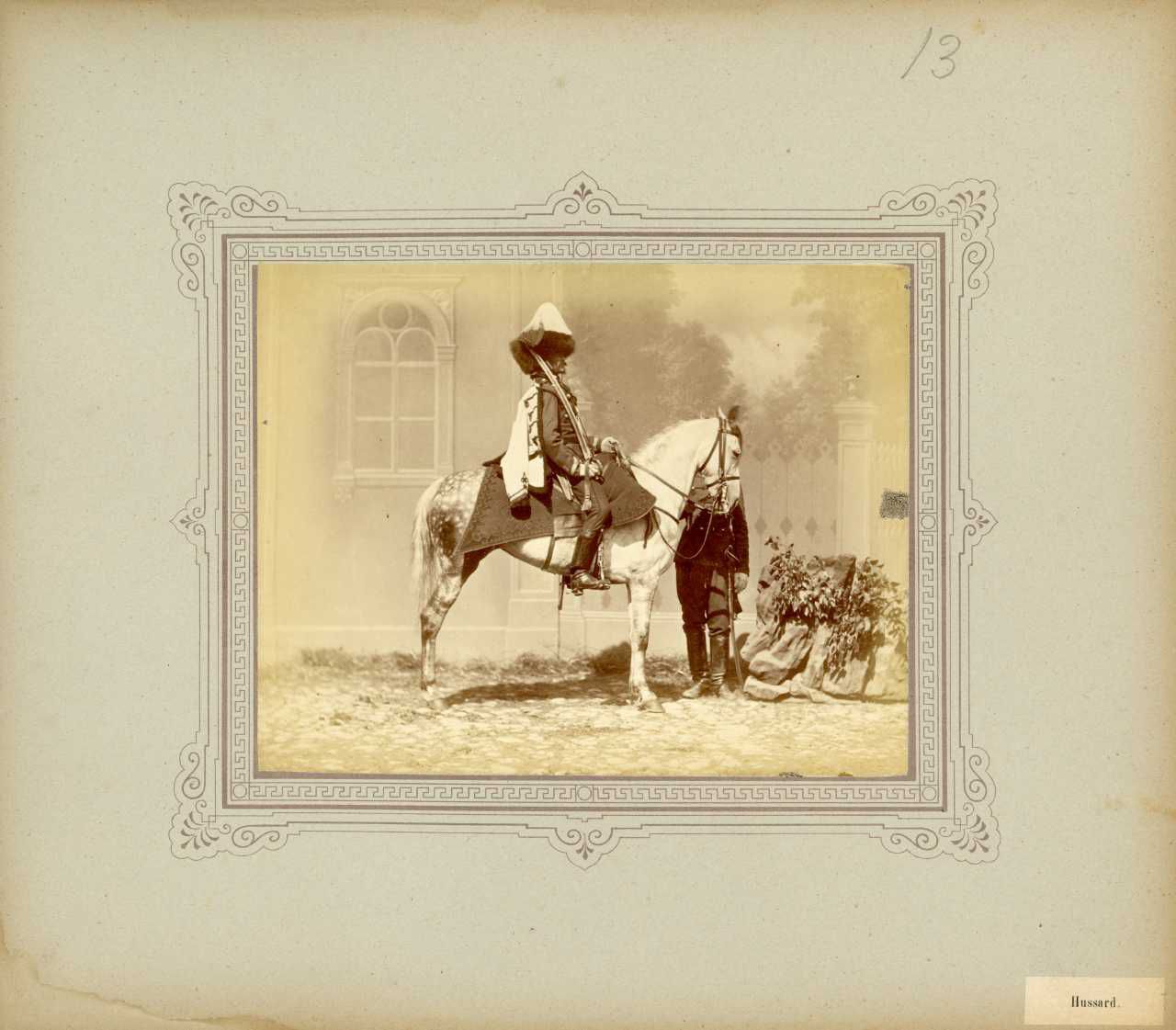 Foto af husar til hest med karakteristisk stor colback som hovedbeklædning. Fra album "Armeé Russe". Fransk tekst: "Hussard"