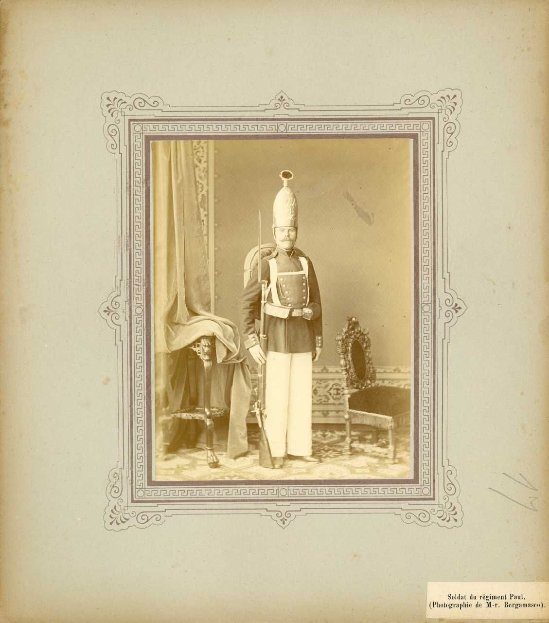 Foto af Soldat fra Pavlovskij Garde Regiment. Han bærer fuld feltmæssig udrustning inkl. høj grenaderhue. Fra album "Armeé Russe". Fransk tekst: "Soldat du régiment Paul. (Photographie de M-r. Bergamasco)."