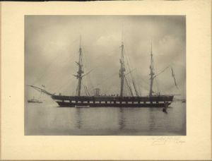 Foto (Kopi): Fregatten "Jylland" (1862-1908) til ankers set mod b.b. Gøs og flag under gaffel. Foran for stævnen et dampskib. Formentlig fotograferet på inderheden. På gags. Skrevet "Hans sidste kommando". Opklæbet på beige karton.