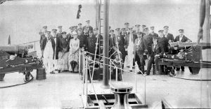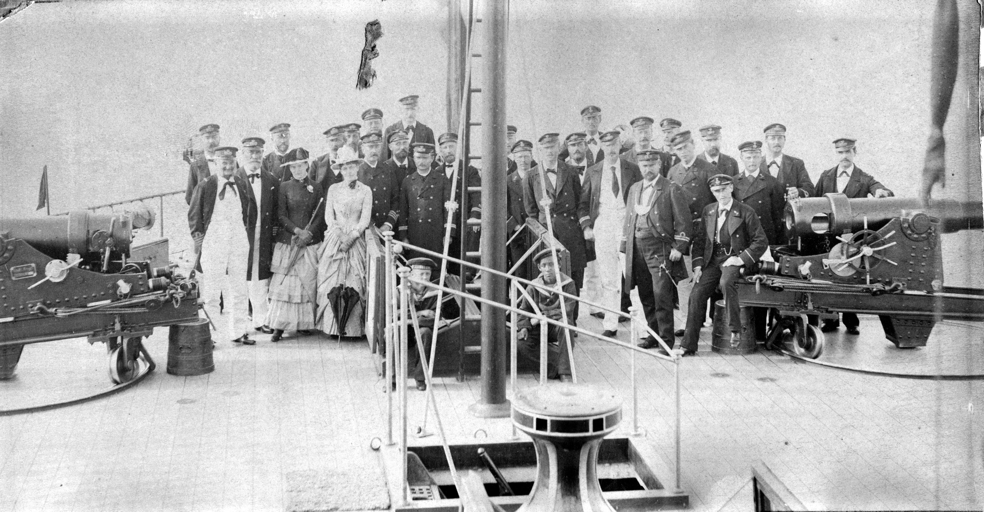 Foto: Gruppebillede formentlig taget om bord i panserbatteriet "Helgoland", (1879-1907). I forgrunden capstan og trappe med metalgelænder. På dækket bag officerer og to damer. Gruppen er placeret mellem kanoner i metalaffutager.Svagt hvælvet mahogniramme