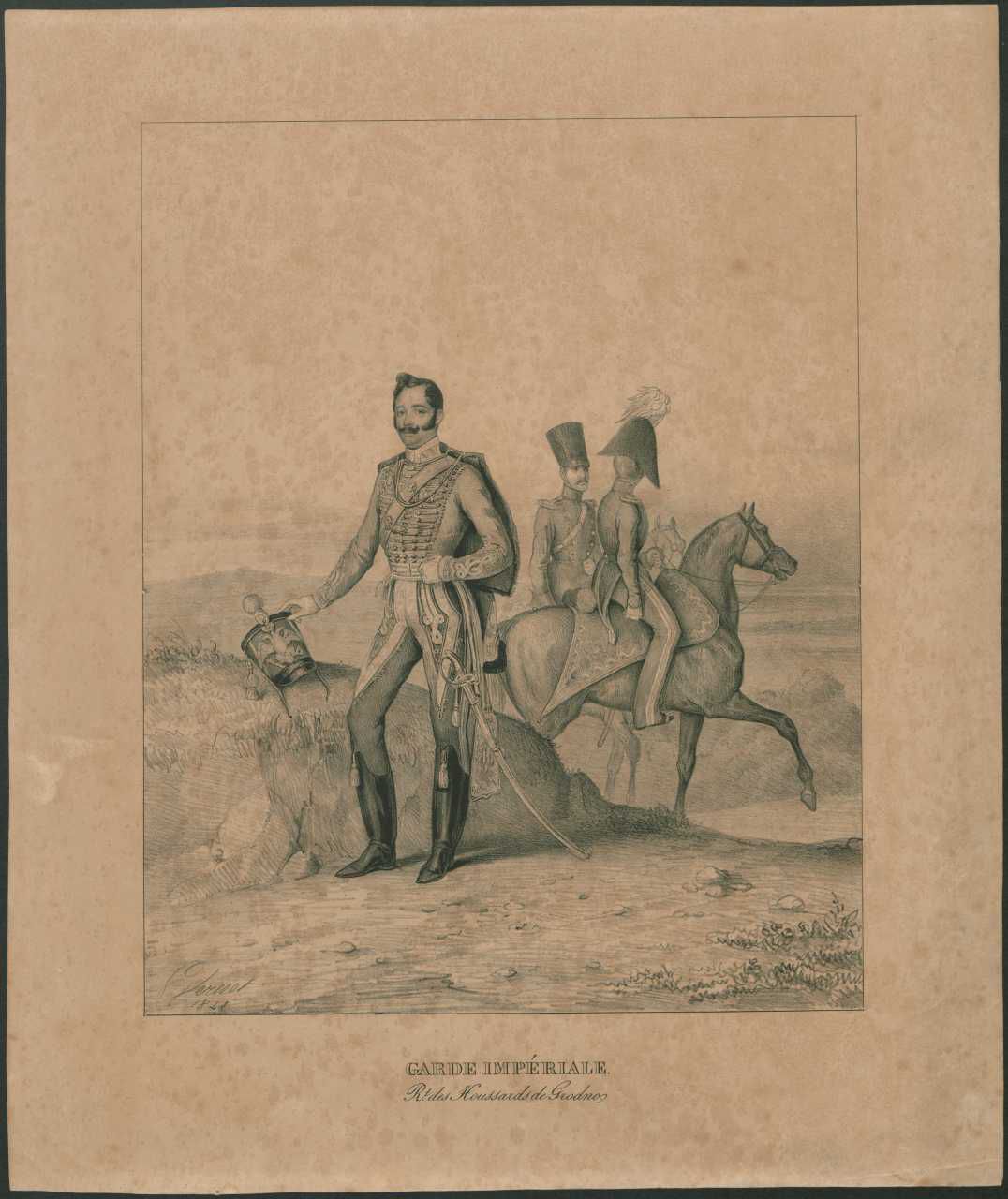 Stik med Grodno-husar, 1821. Tekst under billede: "Garde Impériale, rt des Houssards de Grodno" Fra Gudim-Levkovitj-samlingen.