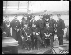 Foto: Gruppebillede: Siddende fra venstre Kadet C.W. Weilbach, KD. C. Bruun, maskinm,. T.C. Sørensen. Stående fra venstre skljt. Alfr. Petersen (død samme år i Christianssand) læge Mortensen, prljt. Friborg Jensen, prljt. Johs. Schultz, kapt. Jensen Bildsøe, prljt. Nyholm og prljt. Trolle. Stående bagerst, skibsintendant Mielsen og sekljt. Em. Wessel om bord i Dagmar under vintertogt til Middelhavet 1887-88. 21 x 27,3 cm.
