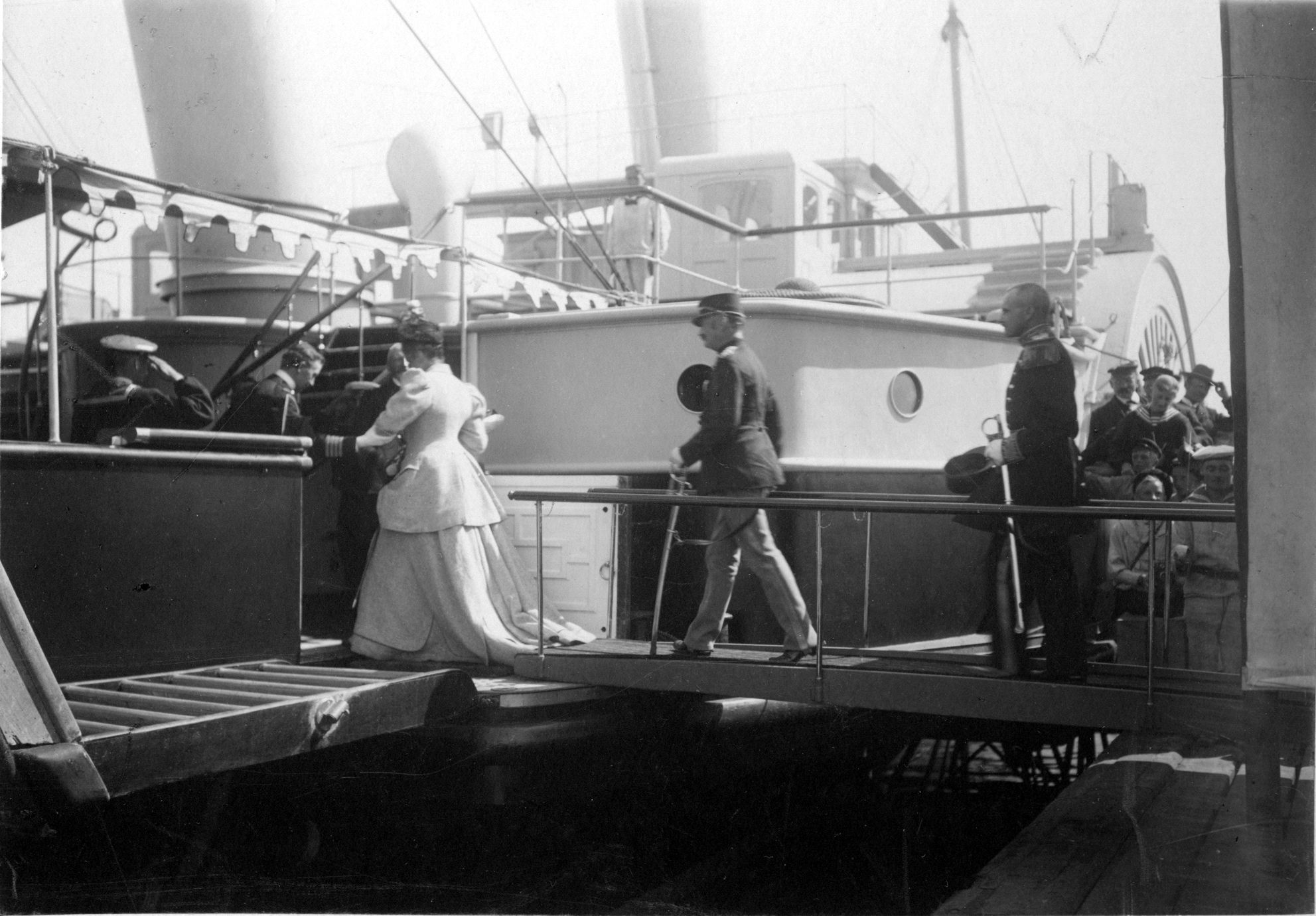 Kong Frederik og Dronning Louise går om bord i kongeskibet "Dannebrog"
