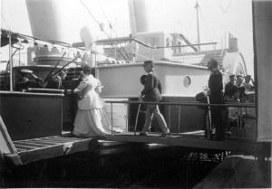 Foto: Kong Frederik og Dronning Louise går om bord i kongeskibet "Dannebrog" i Frederikshavn, 1908. Jagtkaptajn KD. A.P. Hovgaard tager mod dronningen. 21,4 x 26 cm.