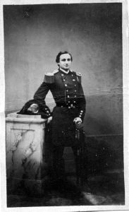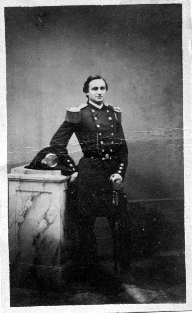 Foto: Frederik Joh. Ortved, f. 1841, død 1862. Galauniform med knapper på ærmeopslagene. Hel figur, visitkortformat.