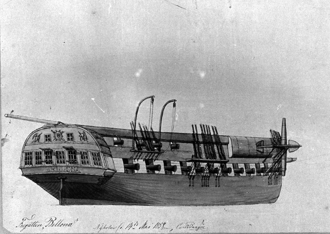 Tuschlavering. Fregatten "Belona" søsat 1830, set agten for tværs mod styrbord. Skibet er tegnet uden rejsning og tovværk bortset fra røster m. jomfruen og vanter indtil lønningen. Åbne kanonporte med kanonmundinger. Anker i kranbjælken, tomme davider, og storbommen afrigget hvilende på hakkebrædtet. Agterspejl med ornamenter og vinduer, hvoraf to åbne. Dateret Nyholm d. 14de Mai 1858. Sign. Carl Baagøe. Flad træramme, lys birk.