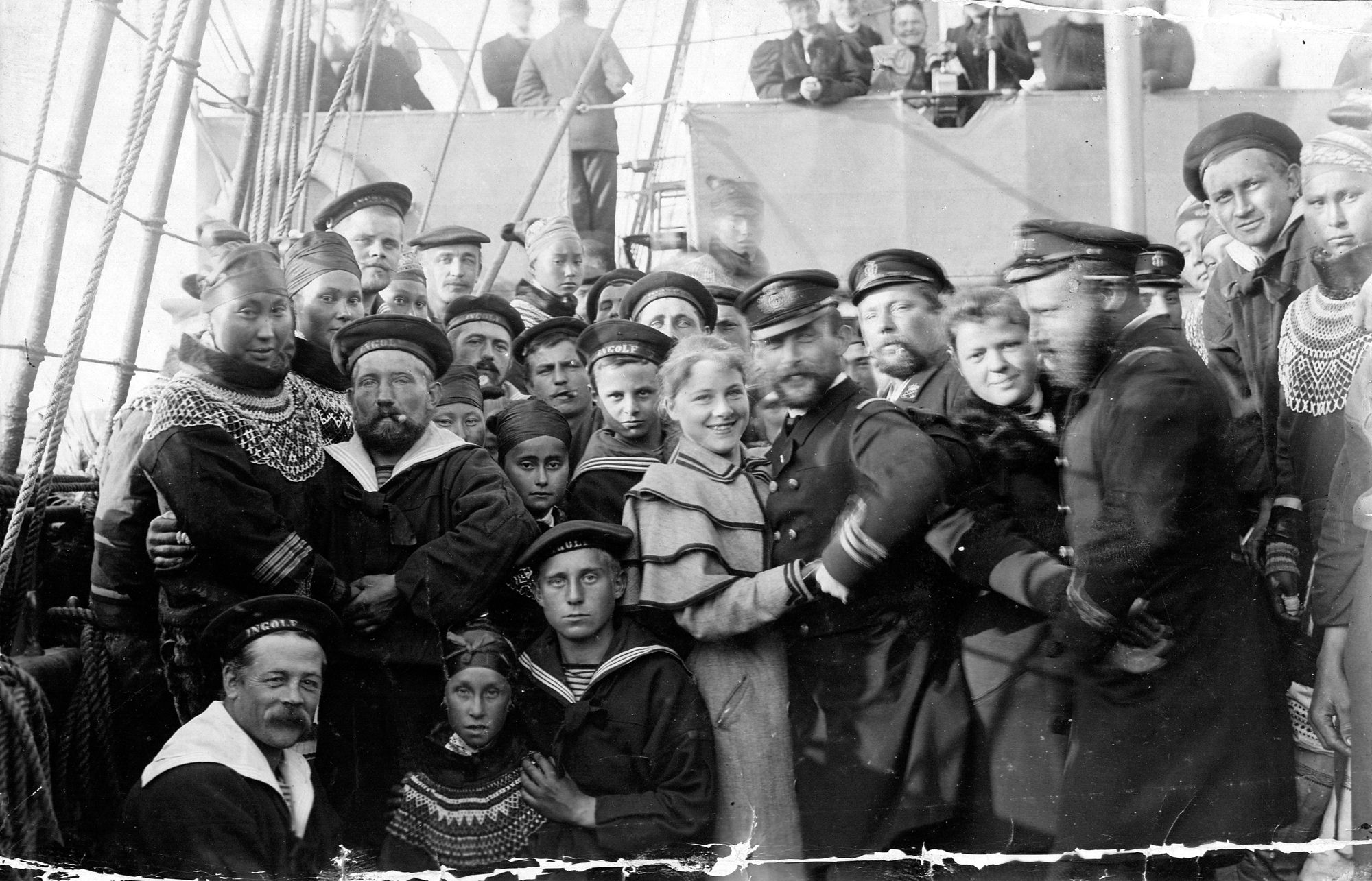 Foto: Selskab om bord i "Ingolf". Officerer og mandskab danser på dækket med damer, danske og grønlænderinder. I forgrunden kaptajn A. Evers og prljt. H.F. Kiær.