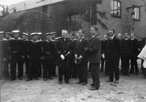 Foto: Fra højtideligheden i gymnastikhuset på Frederiksholm, og ligtoget i forbindelse med overføring af kisterne med de om bord i E.13 faldne engelske orlogsgaster til DFDS´s damper "Vidas" som bragte kisterne til England.