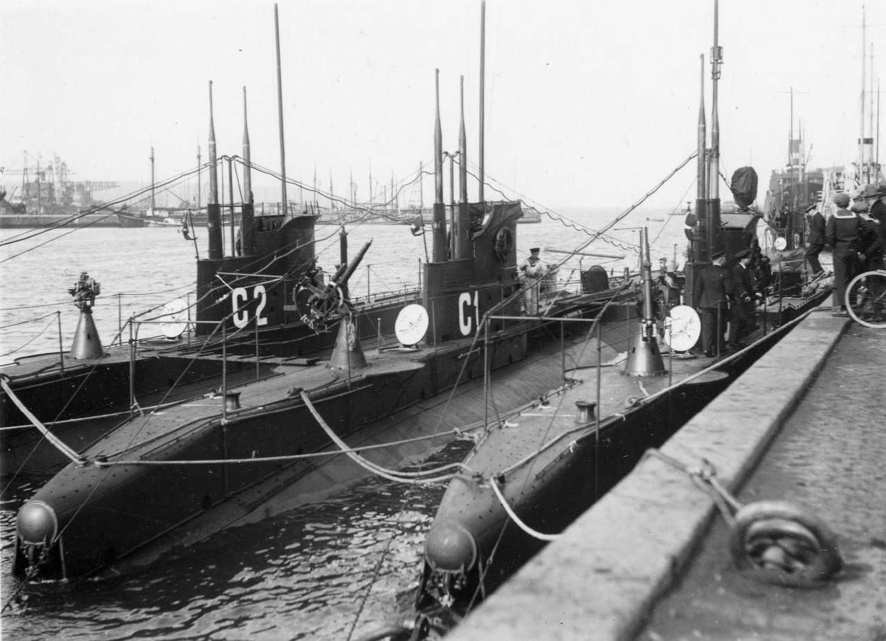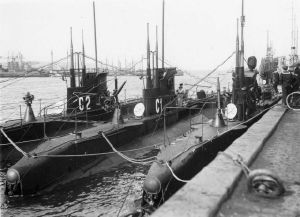 Foto: U-både ved kaj i Aarhus havn set agten for tværs mod styrbord. Fra venstre: "Bellona", "Rota" og inderst "Flora".