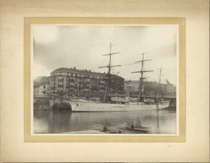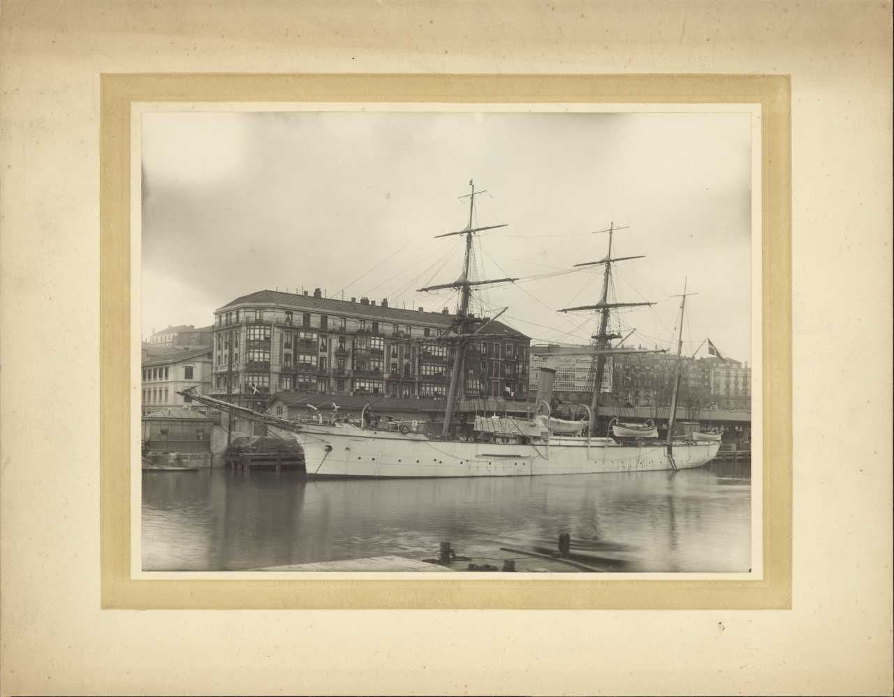 Foto: "Ingolf", Søsat 1876, liggende ved kaj i Bilbao 1921. Set mod bagbord. I baggrunden bebyggelse. Opklæbet på lysegråt karton.