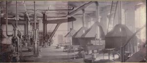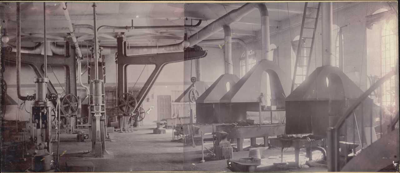 Foto: Panorama af 2 optagelser. Værkstedshal med maskiner til venstre i forgrunden og bag disse 2 stk. kraner. Til højre esser med røgfang. Ramme af lyst egetræ med buet profil inden for smalle, flade lister.