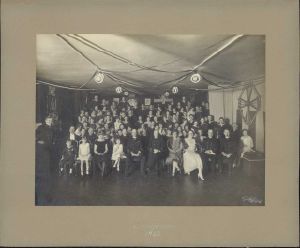 Foto: Gruppebillede. Lærer og elever med damer ved skolefesten 1926 på Dæksofficerselevskolen. Bred mahogniramme.