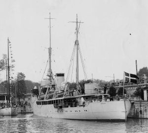 Foto: "Ingolf", søsat 1933, set agten for tværs mod bagbord liggende ved kaj ved Royal Yacht Club, Bruxelles 1934.
