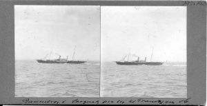 Stereoskopbillede: Kongeskibet "Dannebrog" set mod bagbord med sat fok.