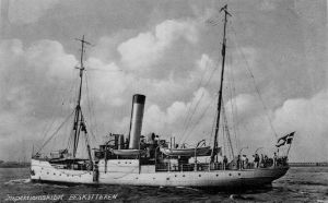 Postkort: "Beskytteren" inspektionsskib (1900-1950). Set i søen mod bagbord.