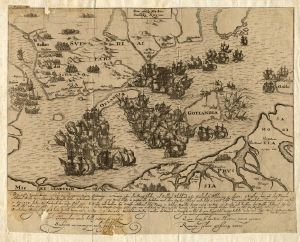 Stik: "Den gandske Siu Aars Svendske Krig". Kort over farvandet mellem Sjælland, Østersøens sydkyst og svenskesysten til Stockholm - Finland og øsel i øst incl. Sydsverige. På kortet indtegnet søkrigsbegivenhederne under krigen 1563-70 me dhenvisningsnumre til text under billedet, ialt 9 henvisninger. For oven til venstre Pagn. 89. For neden til højre C. Ens. Opklæbet på svært, hvidt papir.