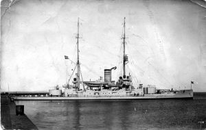 Postkort: "Peder Skram", kystforsvarsskib (1908-1943), I Aarhus havn set mod styrbord.