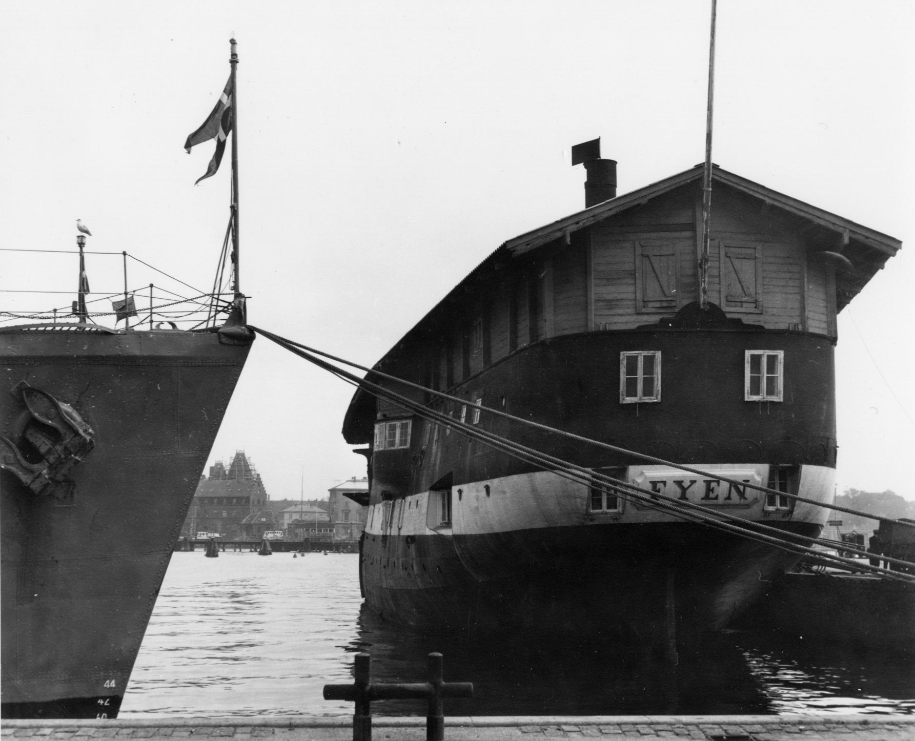 Foto: "Fyen" (kaserneskib fra 1907 til 1962) set mod agter fortøjet ved Elefanten med forstævnen mod vest.