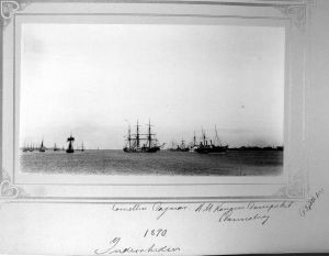 Foto: Københavns inderrhed med "Dagmar" og Dannebrog" begge set foran for tværs mod styrbord. Opklæbet på gråt karton med guldtryk.