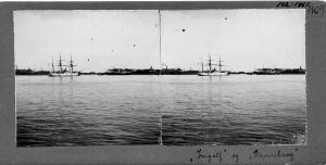 Stereoskopbillede: "Ingolf" og "Dannebrog" på Københavns rhed, i baggrunden til højre Nyholms nordside. "Ingolf" set mod styrbord til ankers. "Dannebrog" set mod bagbord ud for Sixtus.