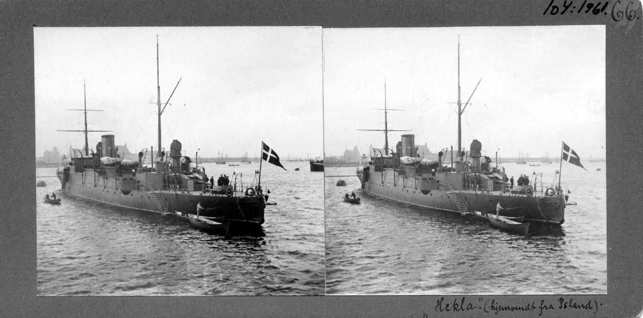 Stereoskopbillede: "Hekla" , søsat 1890, set agten for tværs mod bagbord. Ved faldnetstrappen agter 2 fartøjer med mand i det ene. Text med blæk: "Hekla" (hjemvendt fra Island).