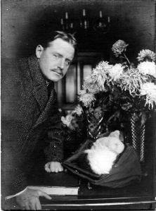 Foto: Godfred Hansen i civil. Lænende sig over et bord med blomster og en bog. Halvt en face mod højre.
