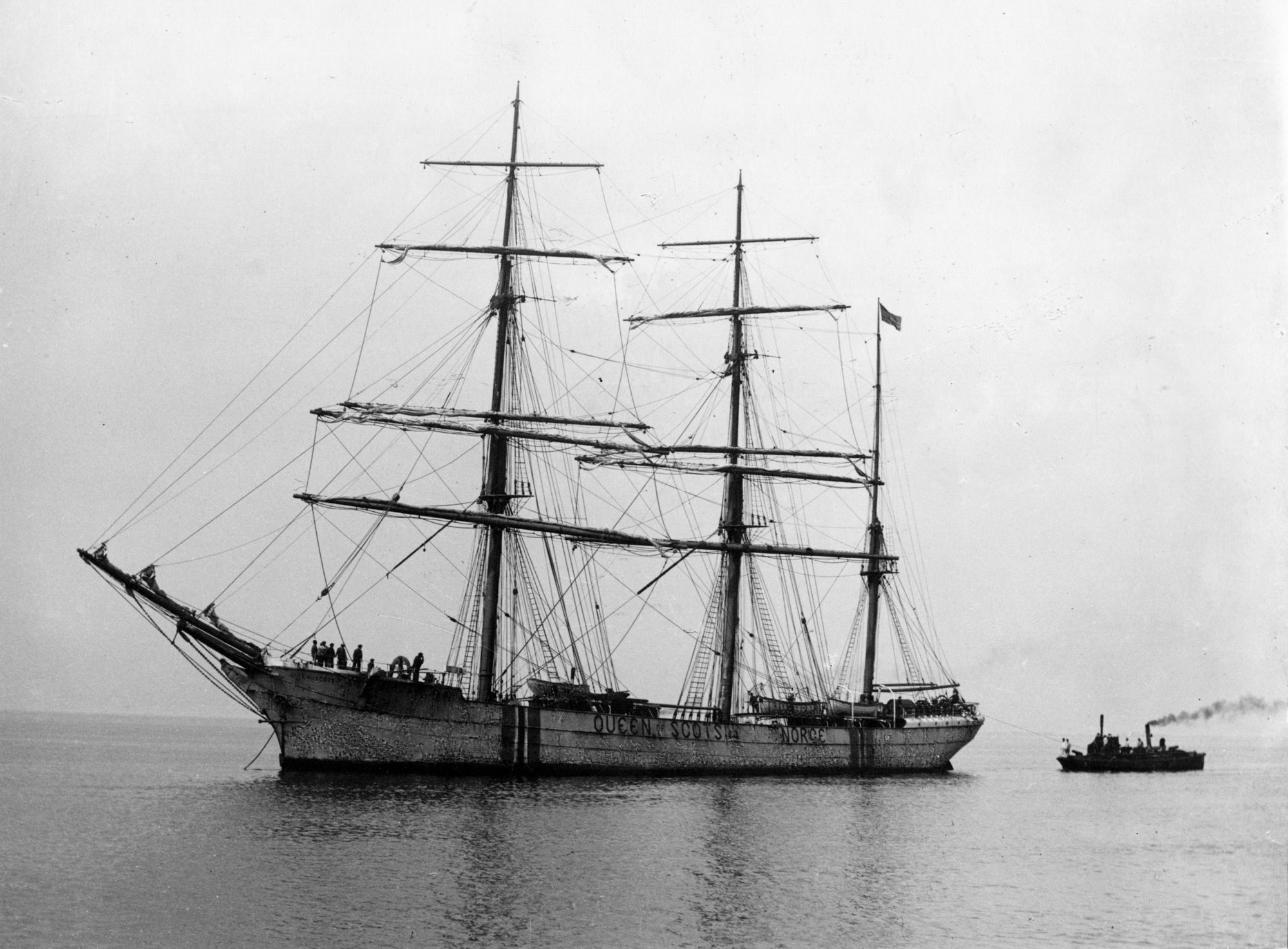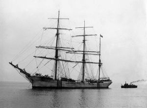 Foto: P.5. eller P.6. (1890-1927) set mod styrbord bugserende norsk bark, "Queen of Scots". Patroullebåden liggende agten for barken, der ses mod bagbord.