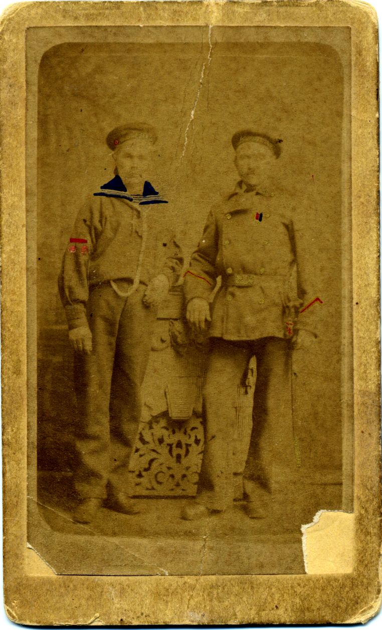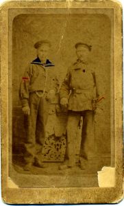 Foto: Til venstre underfyrbøder i bosseronne, til højre overfyrbøder i langtrøje med livrem og sabel med indvendige arme hvilende på bordkant. (let kol.) Kabinetsstørrelse. På bagsiden følgende text: Her staar to Børster som altid tørster, De drikker kun lidt Men dygtig og tit - Christian den 19de April 1883.