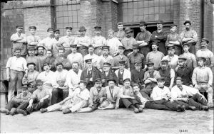 Foto: Gruppebillede. Arbejdere foran Orlogsværftets smedie 1890. Gult passe partout med text: Kjøbenhavn 1890. Flad ramme lysebrunt stuk med lyse lister ind- og udvendig.