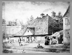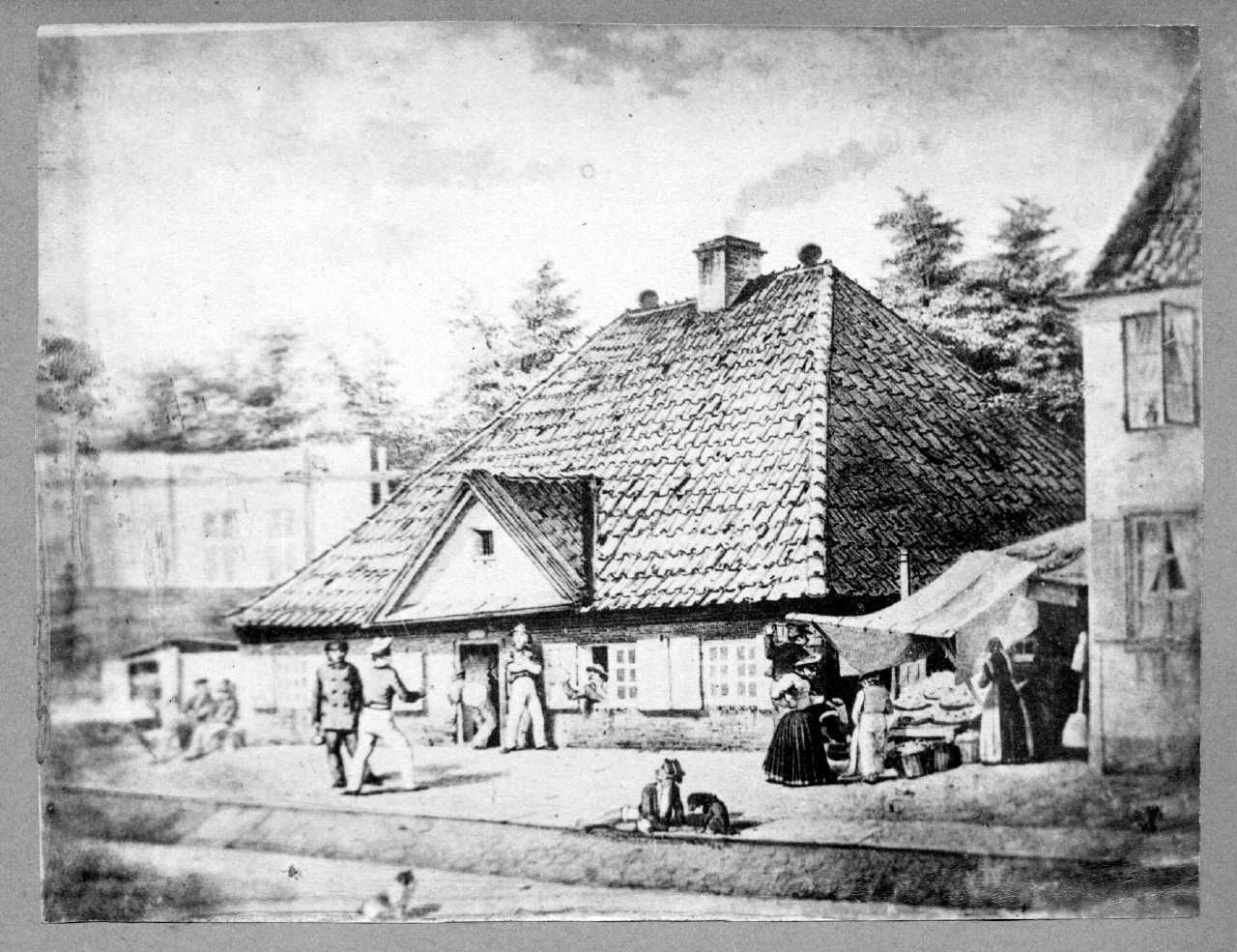 Foto: Efter tegning (?) Forestiller Brokkens bod, gæstgiveri på Toldbodvej. Lav bygning med skodder, midterdør, trekantet gavlkvist og højt valmtag. Til højre herfor bod med sælgersker og kant af 2-etagers hus. På fortovet natroser, børn m.v. I baggrunden lys bygning og træer. Opklæbet på gråt karton, buet, smal ramme.
