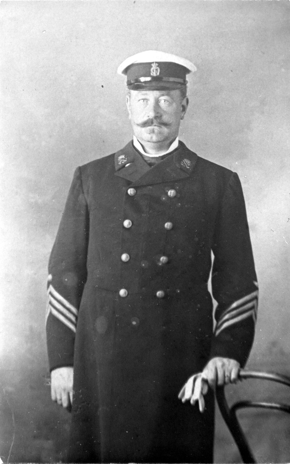 Foto: Overhornblæser i tjenestefrakke med hvid kasket. Handsker i venstre hånd, der støtter til stoleryg. Format postkort. Knæstykke.